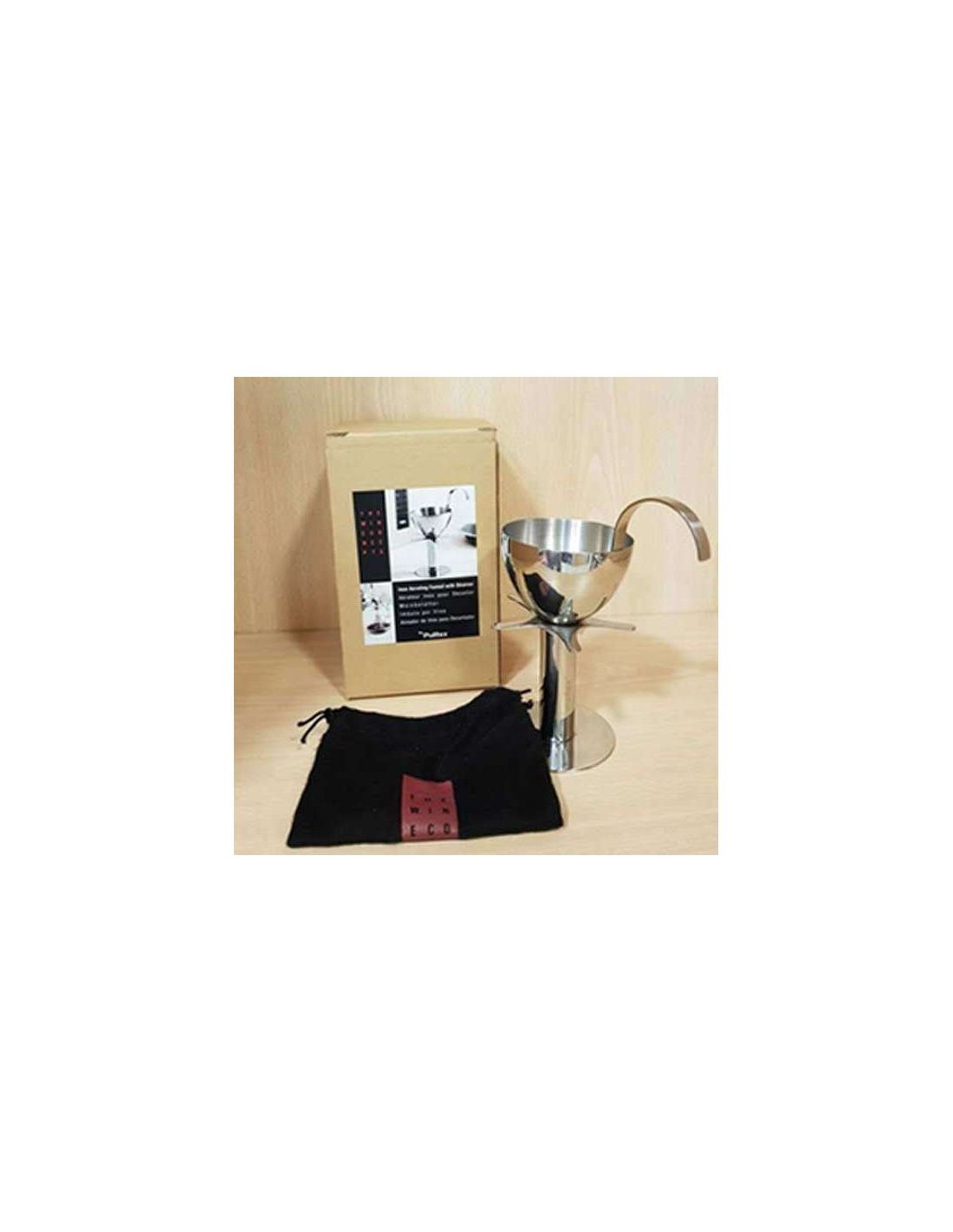 Facilita la aireación del vino vertiendolo por las paredes del decantador de forma uniforme y pausada de manera que entra en contacto con la máxima superficie de aire posible antes de entrar en el decantador. La estrella lo mantiene levantado para que siempre haya circulación de aire dentro del decantador. El filtro evita que entren impurezas